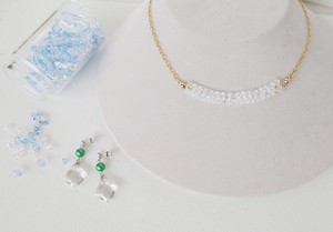 今回はクリスタルシマーを使用したネックレスとプリンセスカットのスワロフスキーを使用したイヤーアクセサリーをお作りいただけます。